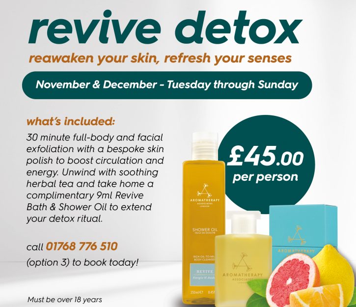 Reawaken your skin and refresh your senses with our limited-time spa package. Includes a 30-minute full-body and facial exfoliation using a bespoke skin polish, followed by a calming herbal tea. Enjoy a complimentary 9ml Revive Bath & Shower Oil to continue your detox ritual at home. Available November & December – Tuesday to Sunday £45 per person Must be over 18. T&Cs apply. Call 01768 776 510 (option 3) to book.